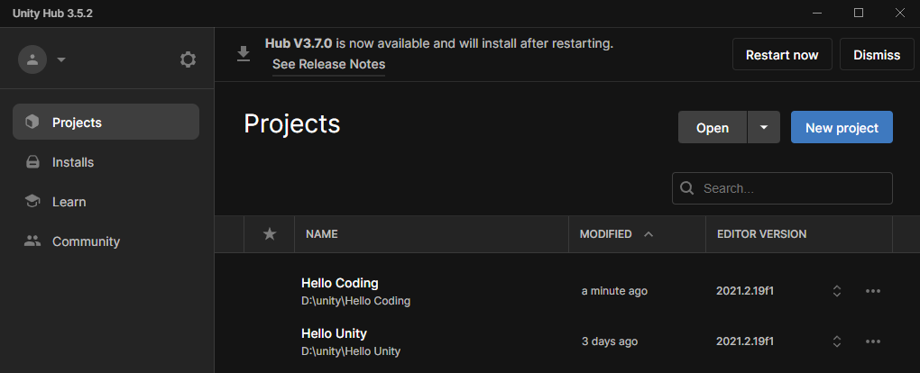 C# 스크립트 작성을 위해 Hello Coding이라는 연습용 프로젝트를 새로 생성함